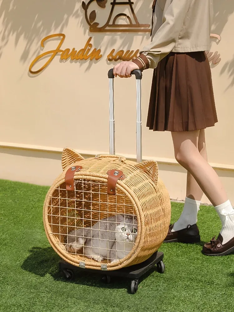 Pet Rolling Luggage Cat Carrier - Portable Rattan Pet Stroller for Cats and Dogs, Breathable, Spacious Backpack for Travel with Your Furry Friends