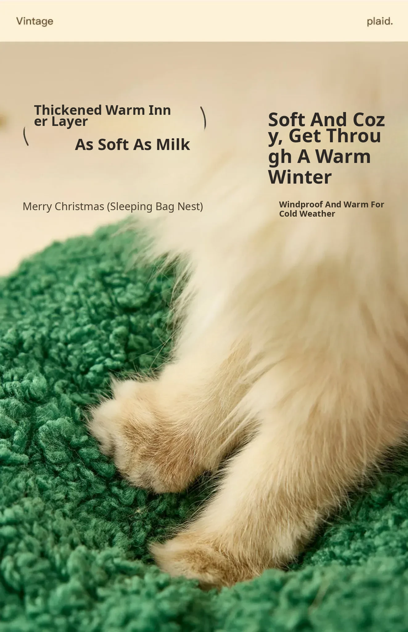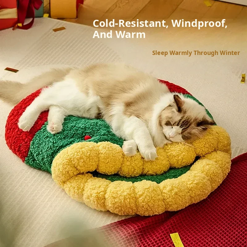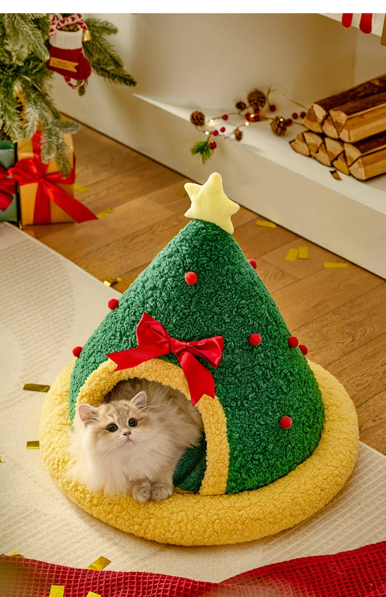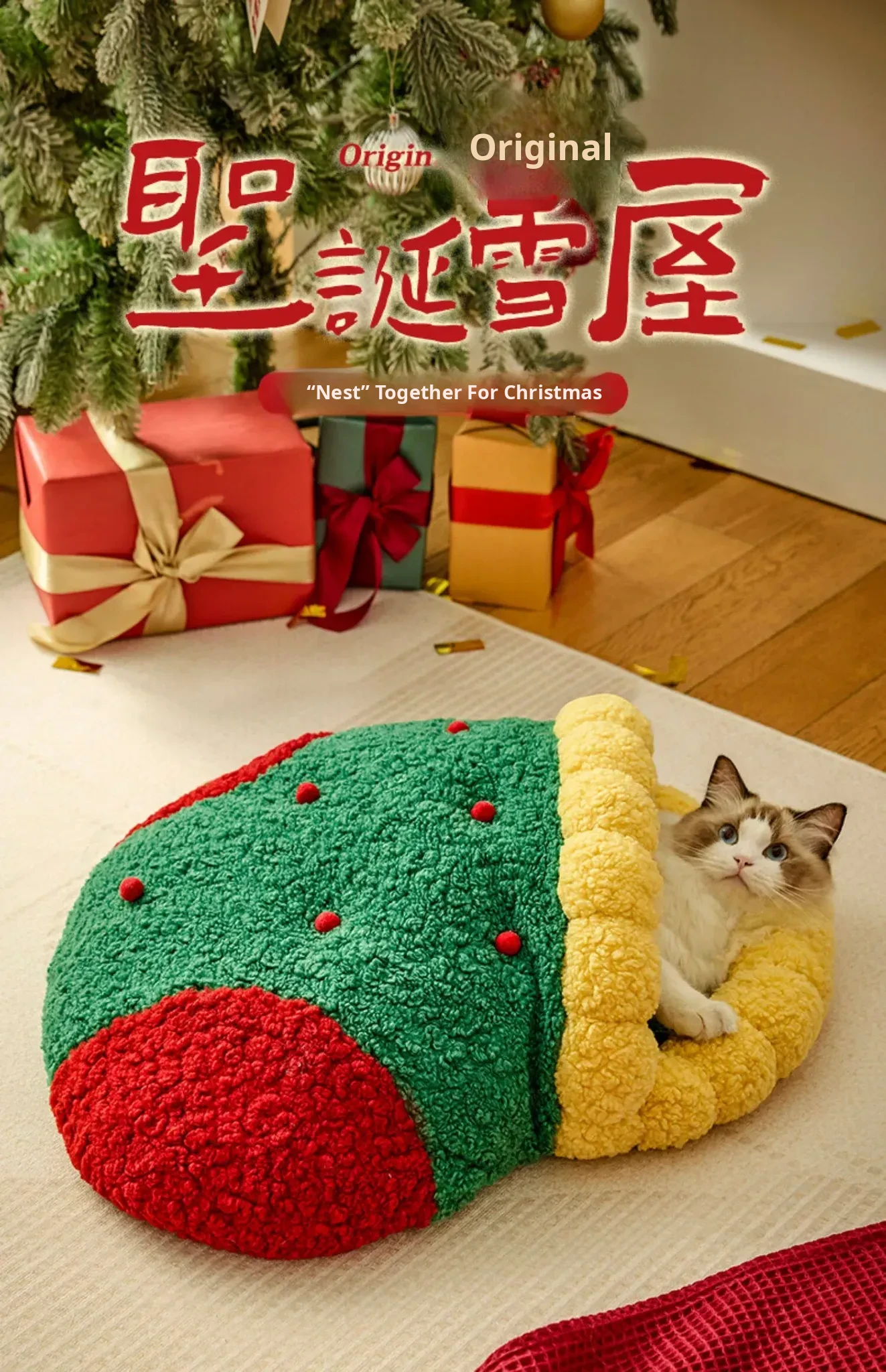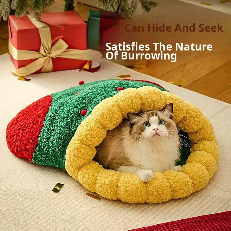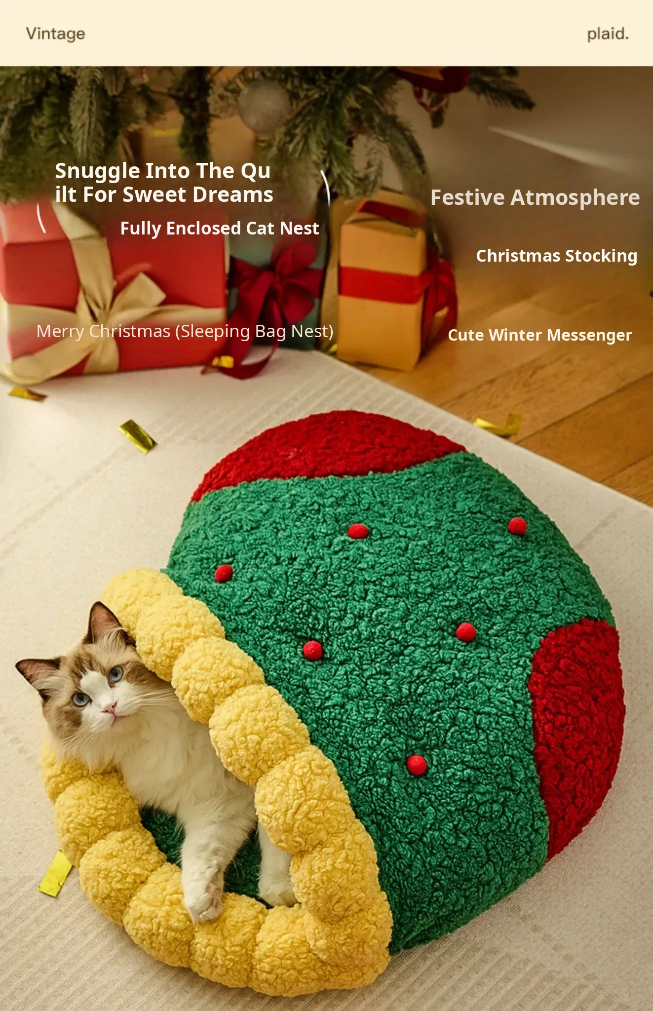 Cozy Winter Cat Bed - Semi-Enclosed Christmas Edition with Tunnel for Deep Sleep, Perfect for Cats and Small Dogs, Ideal for Snuggling and Warmth
