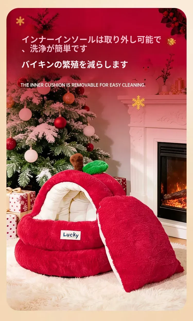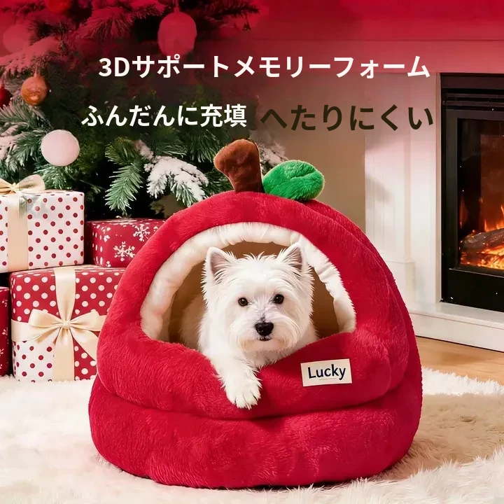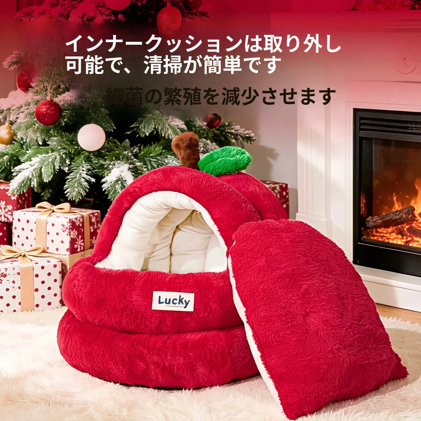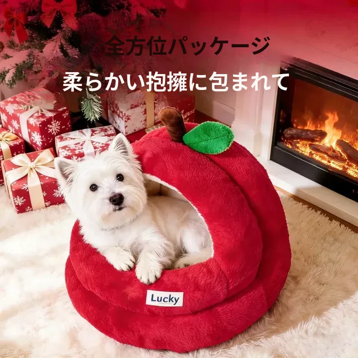 2026年版クリスマス犬用ベッド!厚手の赤いリンゴデザインで、暖かさと安心感を提供する半閉鎖型ペット用スリープマット。冬の寒さから愛犬を守る最高の選択!