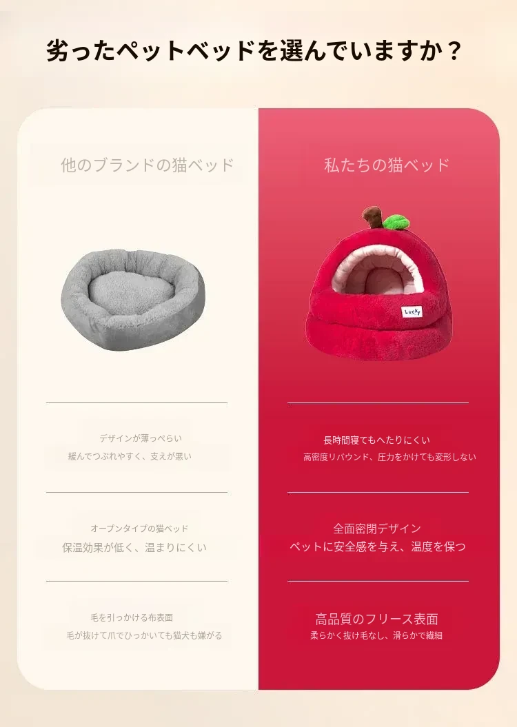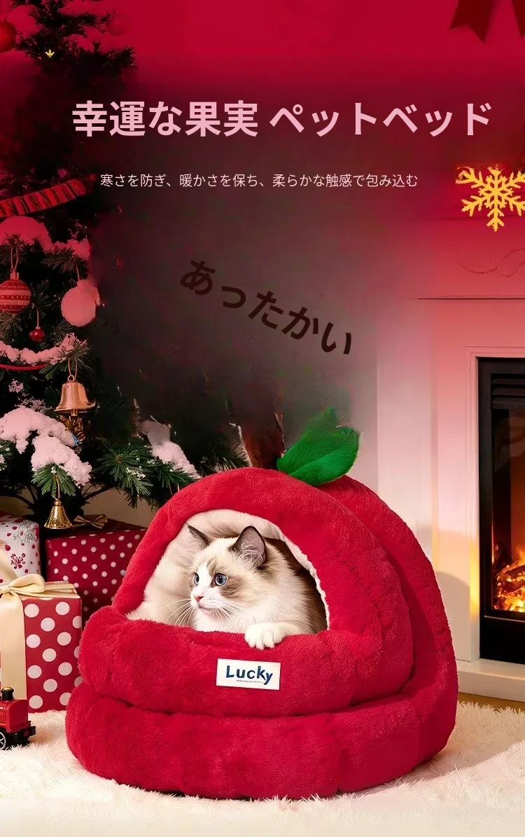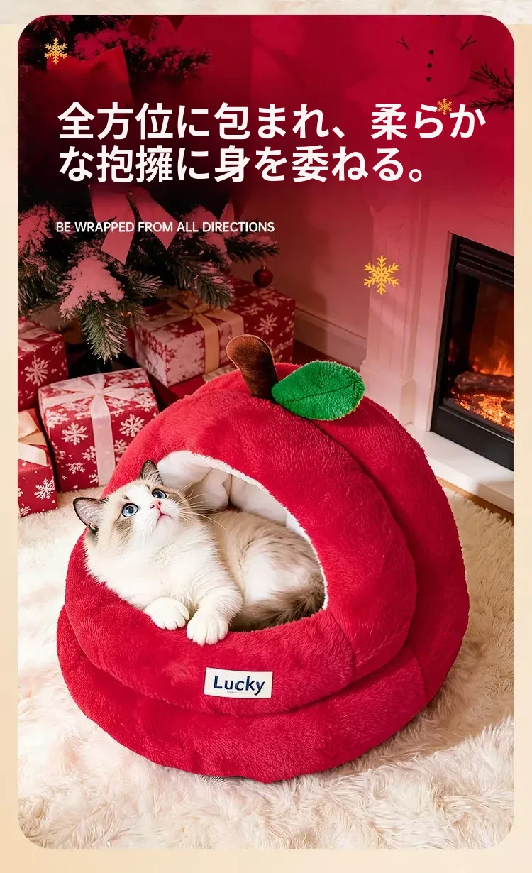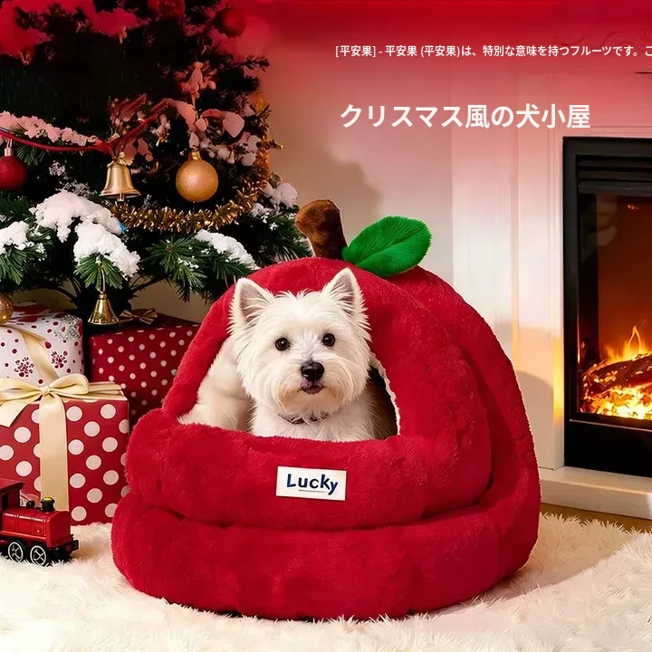2026年版クリスマス犬用ベッド!厚手の赤いリンゴデザインで、暖かさと安心感を提供する半閉鎖型ペット用スリープマット。冬の寒さから愛犬を守る最高の選択!
