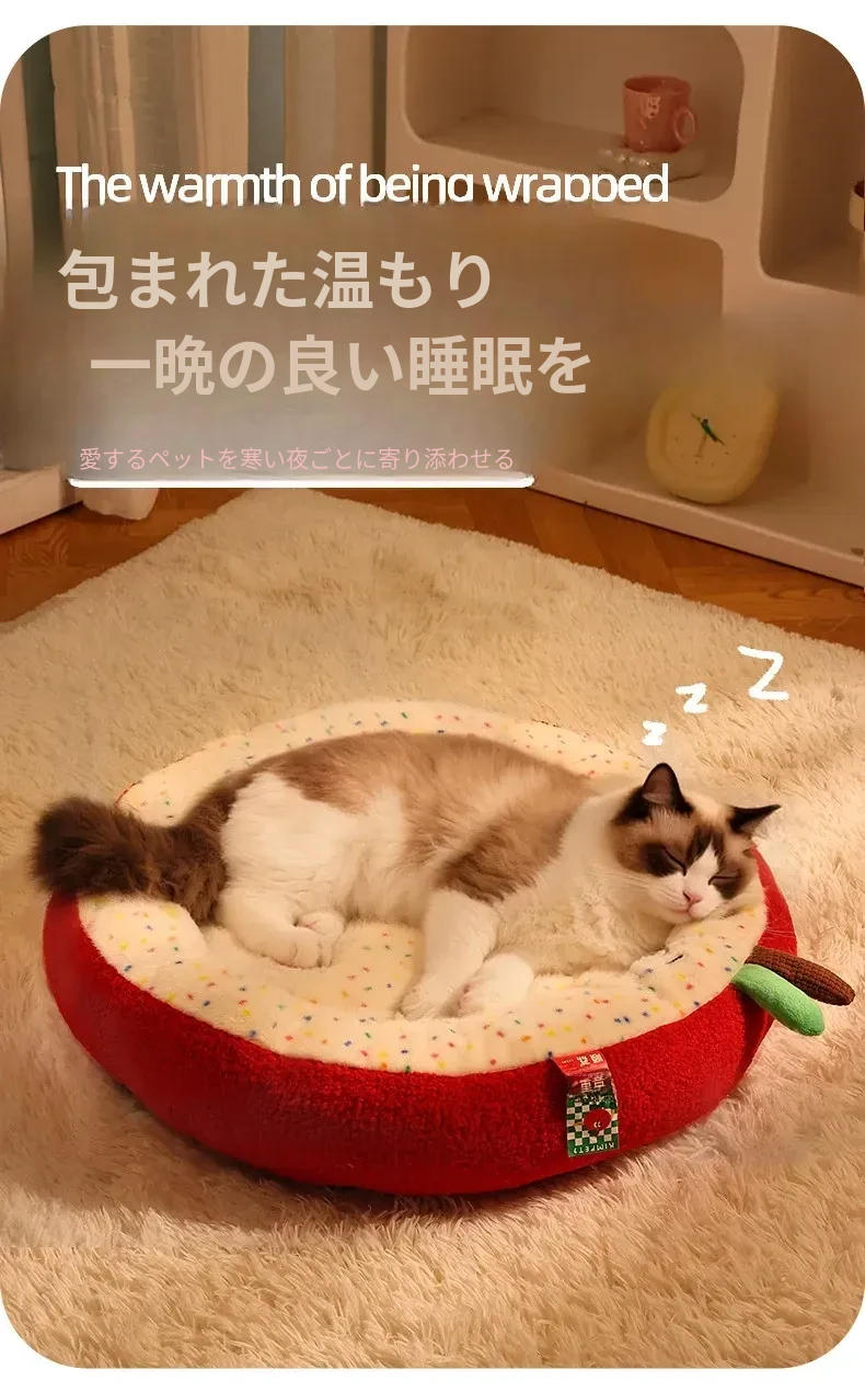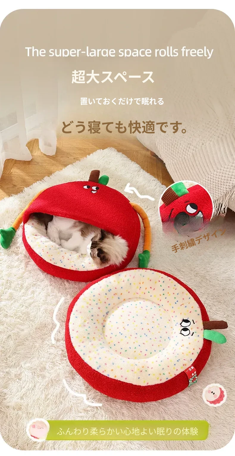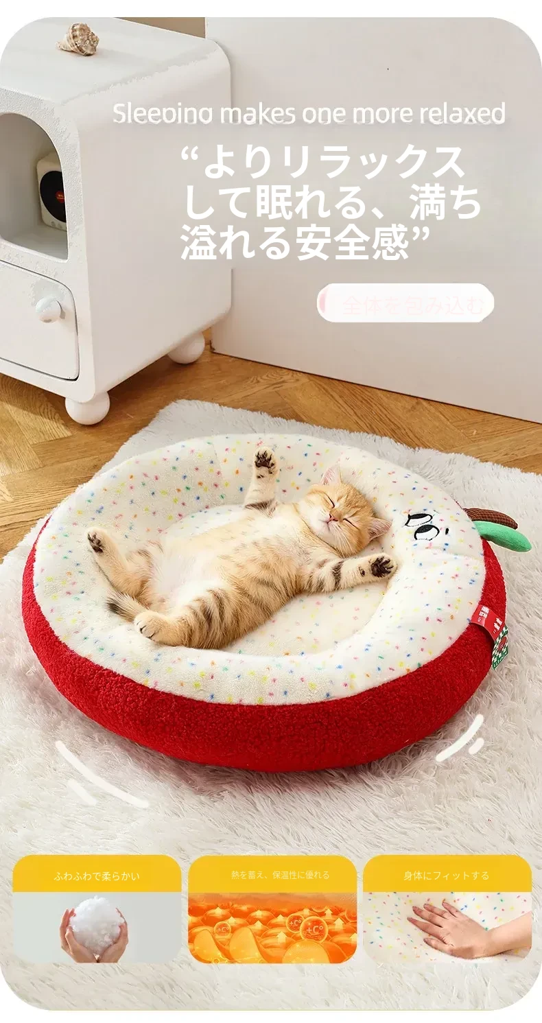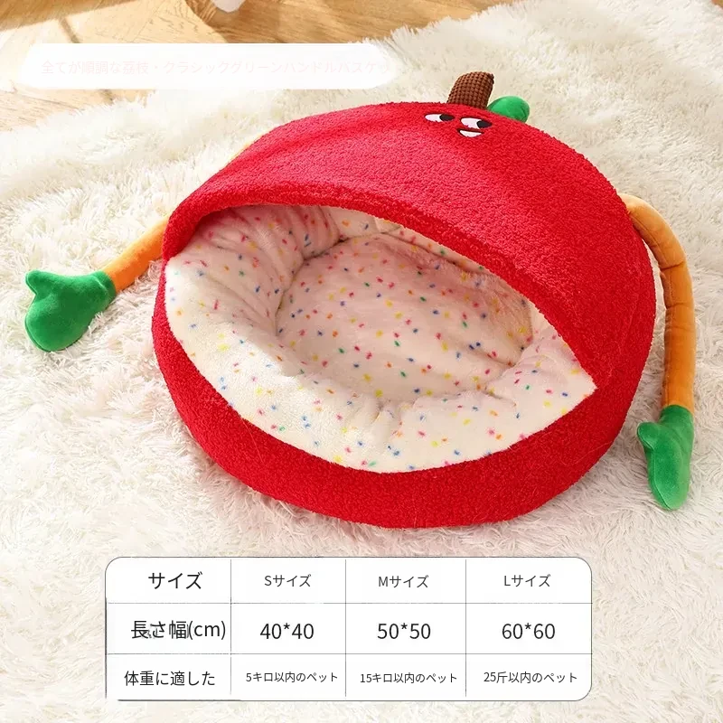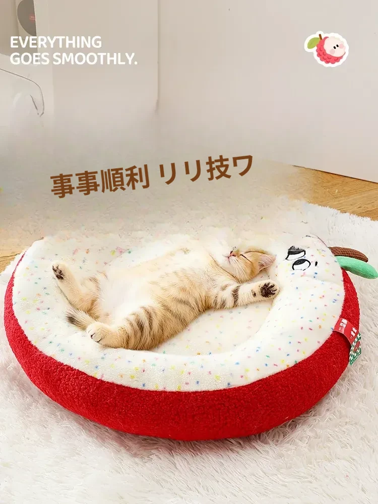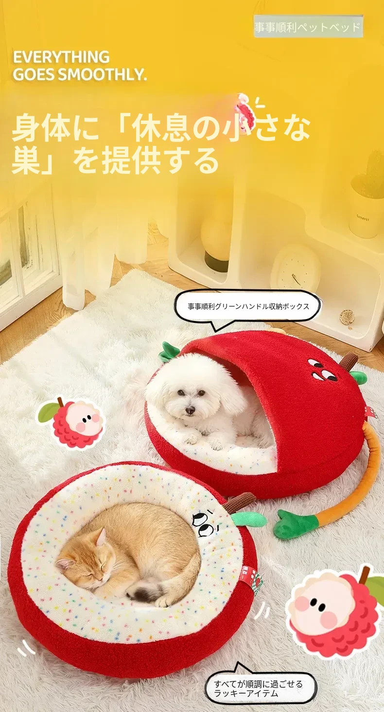 冬の寒さから守る!可愛いライチ型デザインのペット用ベッド。中小型猫や小型犬にぴったりなフリース素材で、四季を通じて暖かく快適な眠りを提供します。
