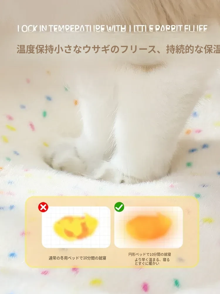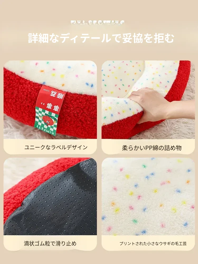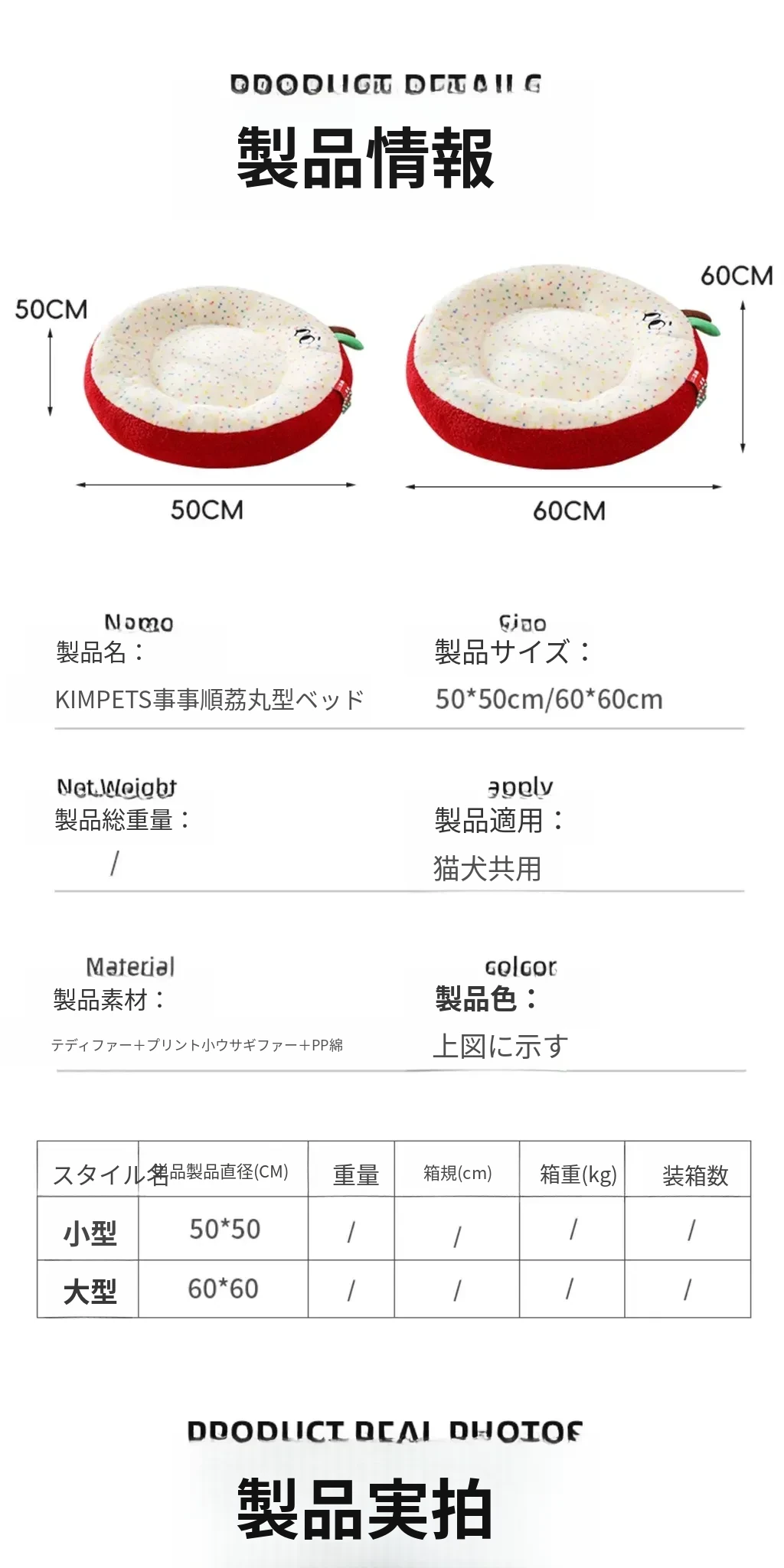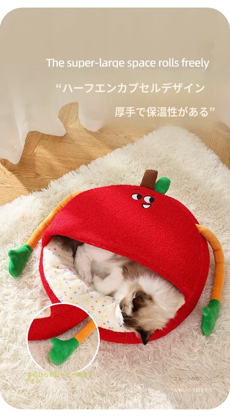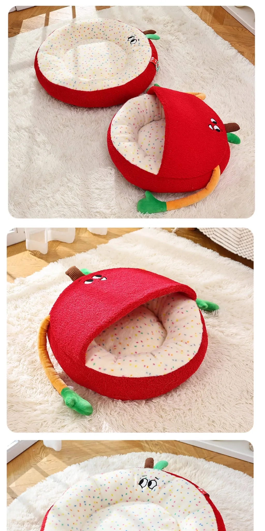 冬の寒さから守る!可愛いライチ型デザインのペット用ベッド。中小型猫や小型犬にぴったりなフリース素材で、四季を通じて暖かく快適な眠りを提供します。