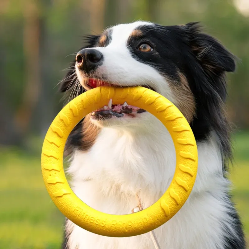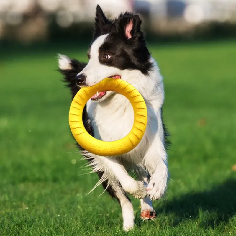犬用耐噛性フリスビー!ボーダーコリーのトレーニングに最適なサーキュラーリング。愛犬の体力を消耗させ、歯磨きにも効果的な柔らかいゴムボール。楽しく遊びながら健康をサポート!