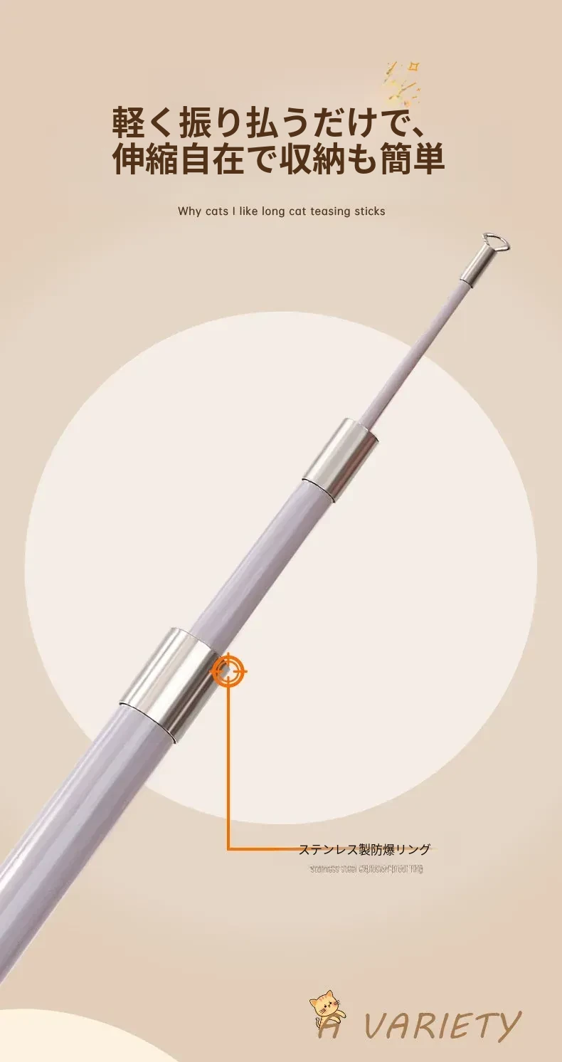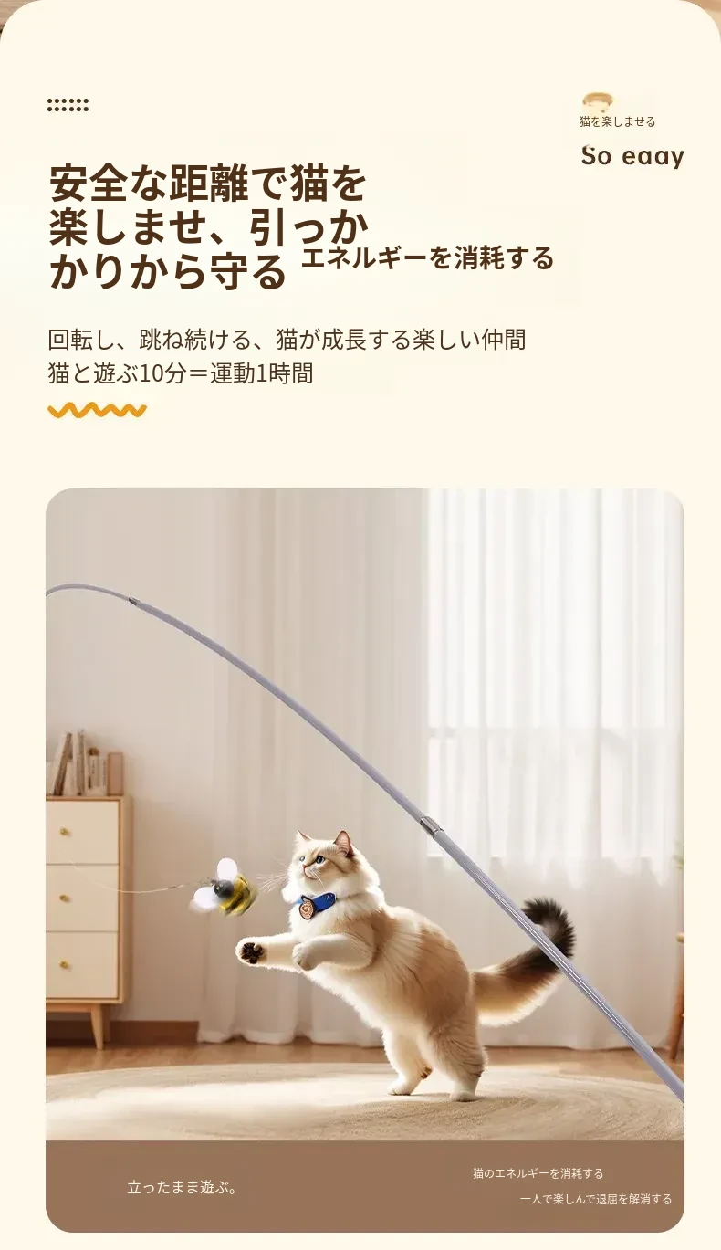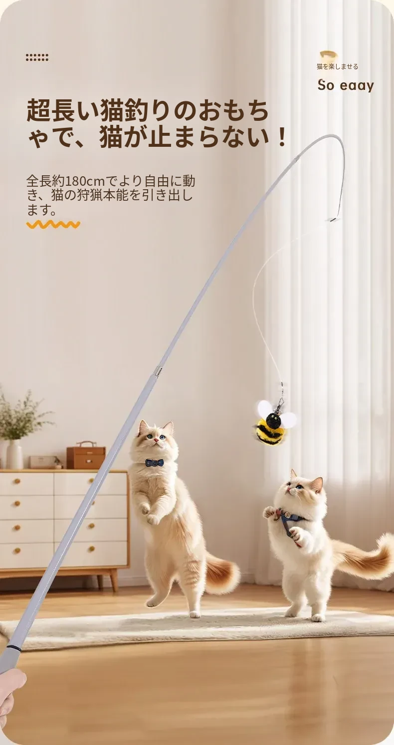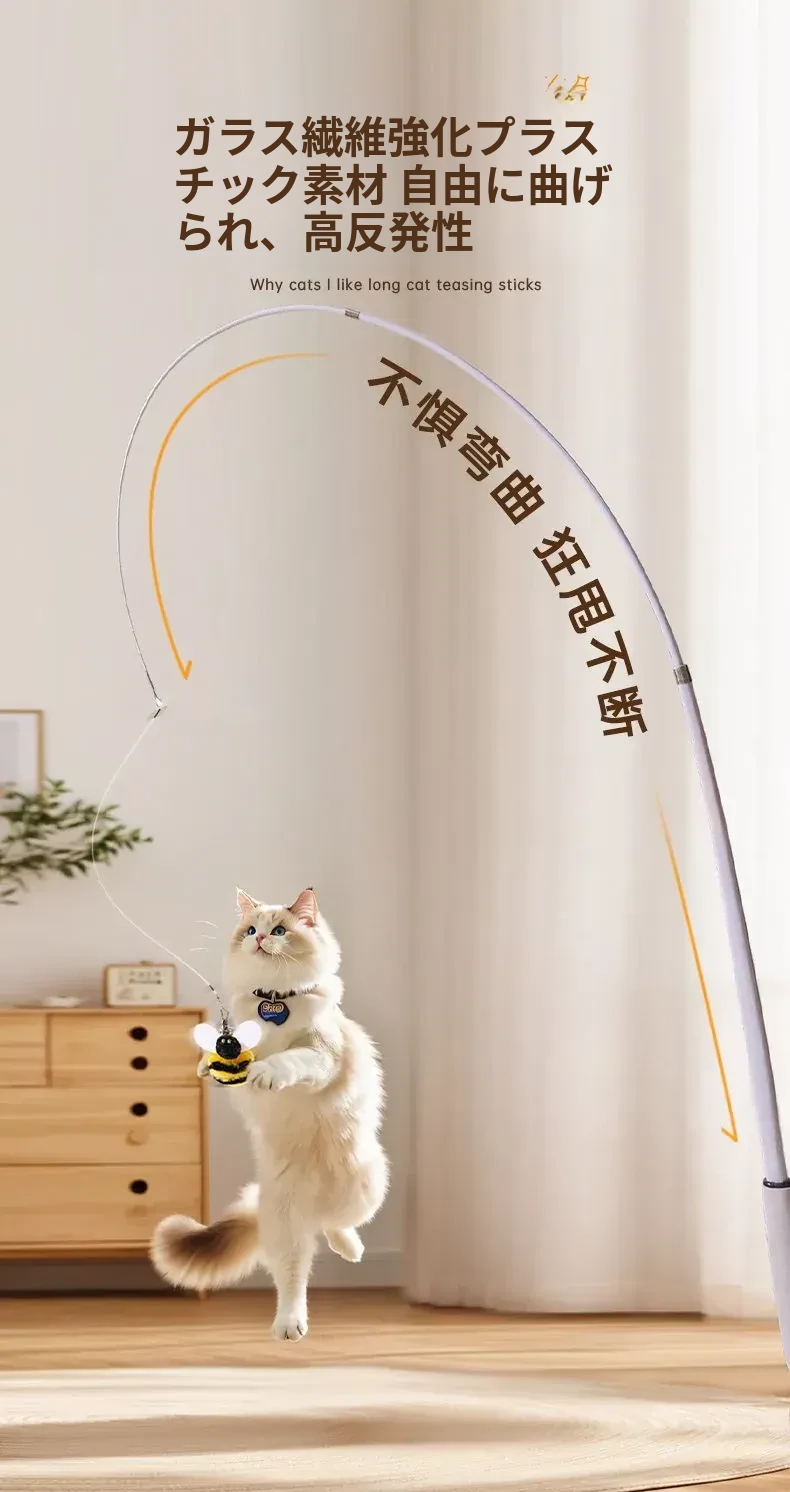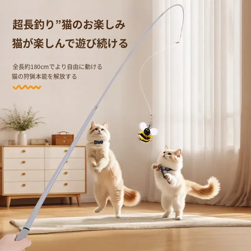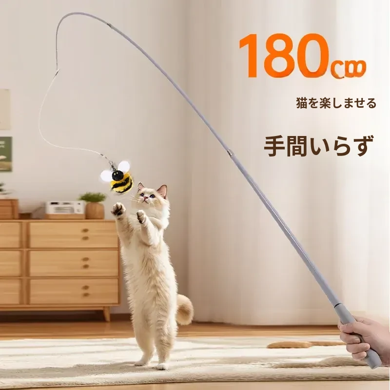 猫ちゃんを夢中にさせる!伸縮式フィッシングロッド型おもちゃ、リアルな昆虫の替えヘッド付き、鈴付きで楽しい!猫の遊びをもっと充実させるアイテム。猫のおもちゃコレクションに必須!