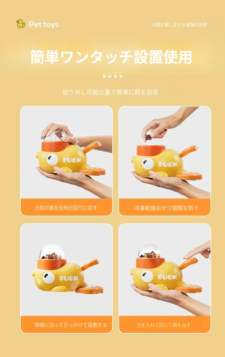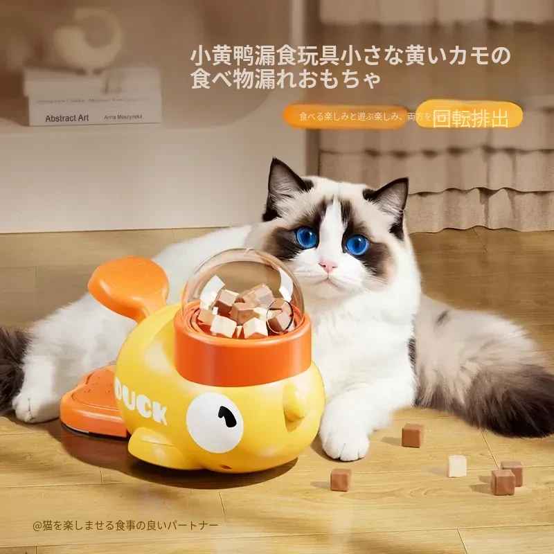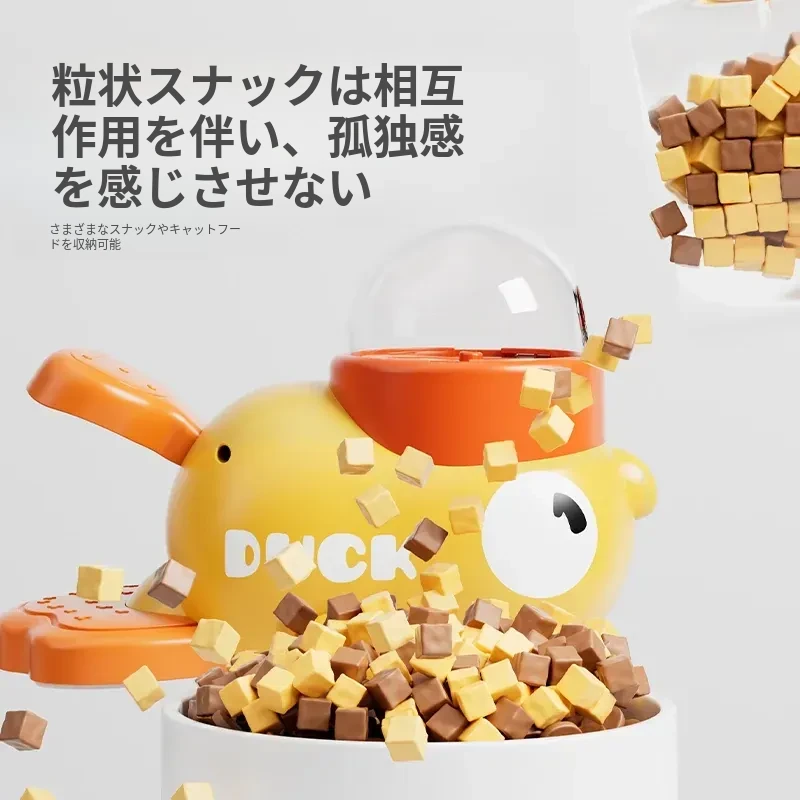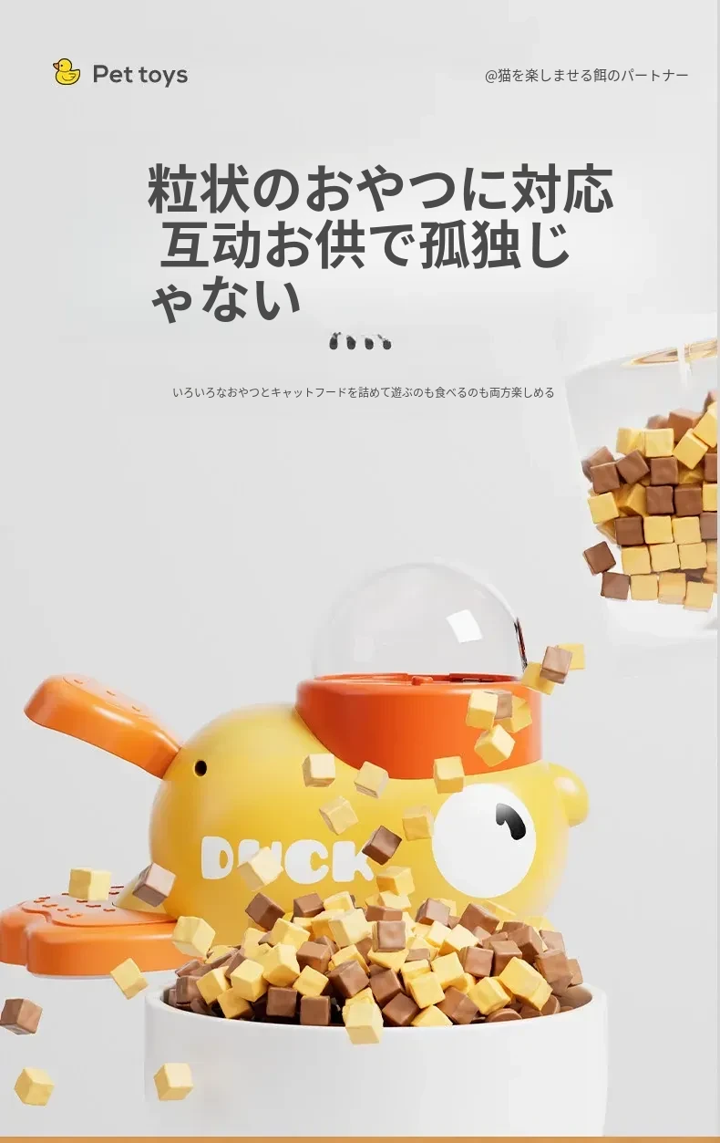 自動で楽しめる猫のおもちゃ!小さな黄いろのアヒル型発射器付き、ペット用の冷凍乾燥おやつも楽しめる!猫も犬も夢中になる、食べこぼし防止の楽しいアイテムです!