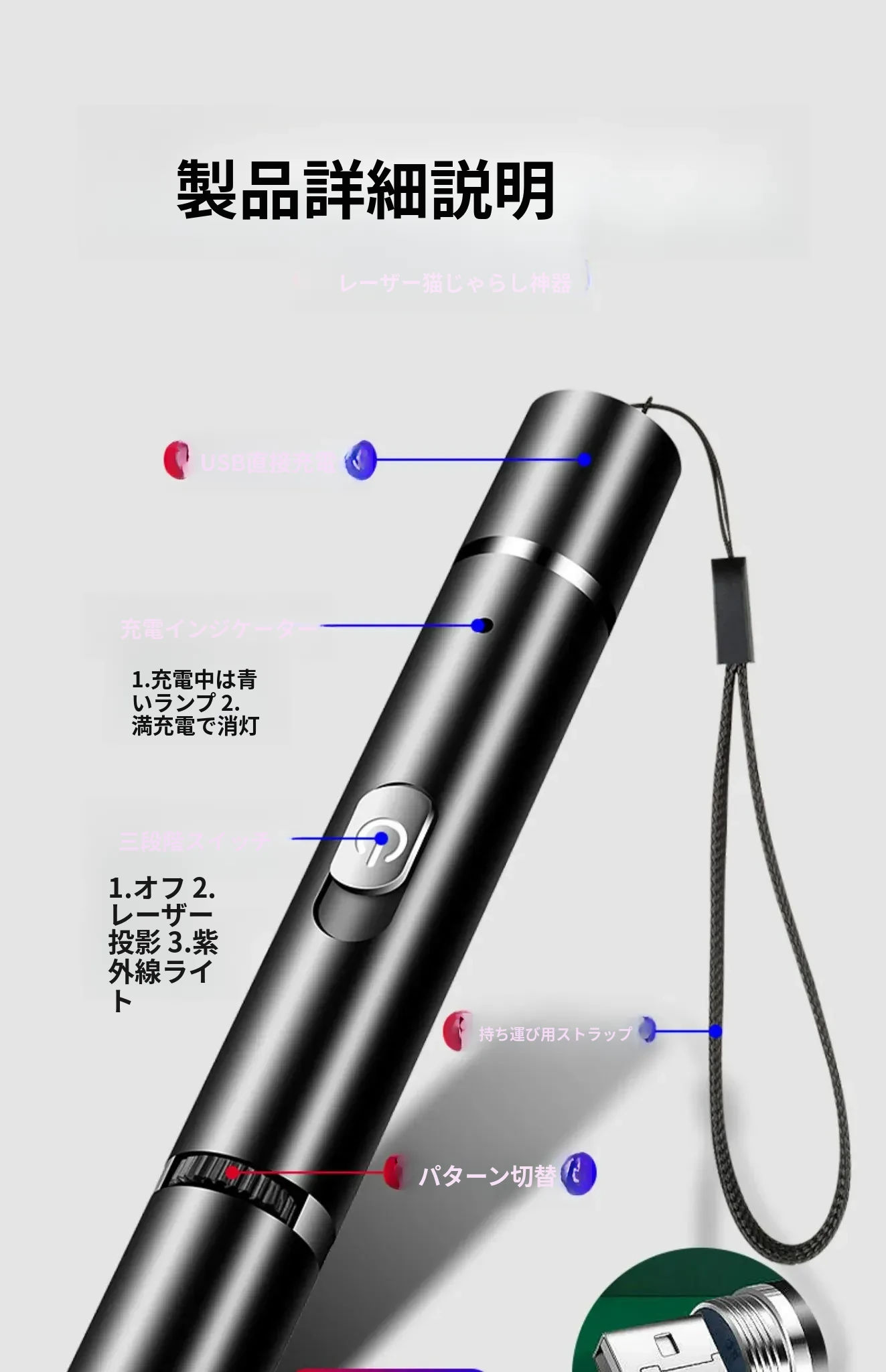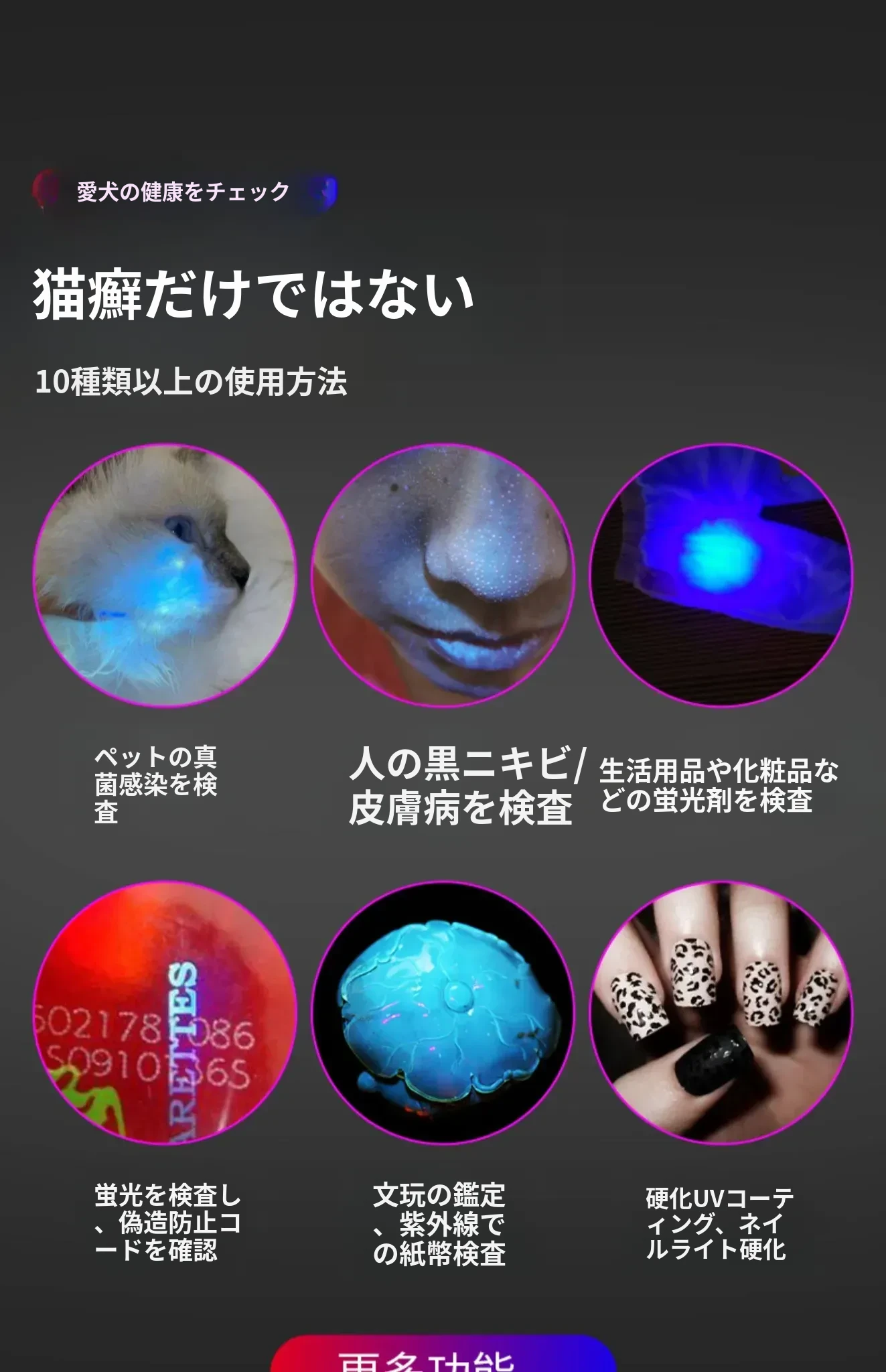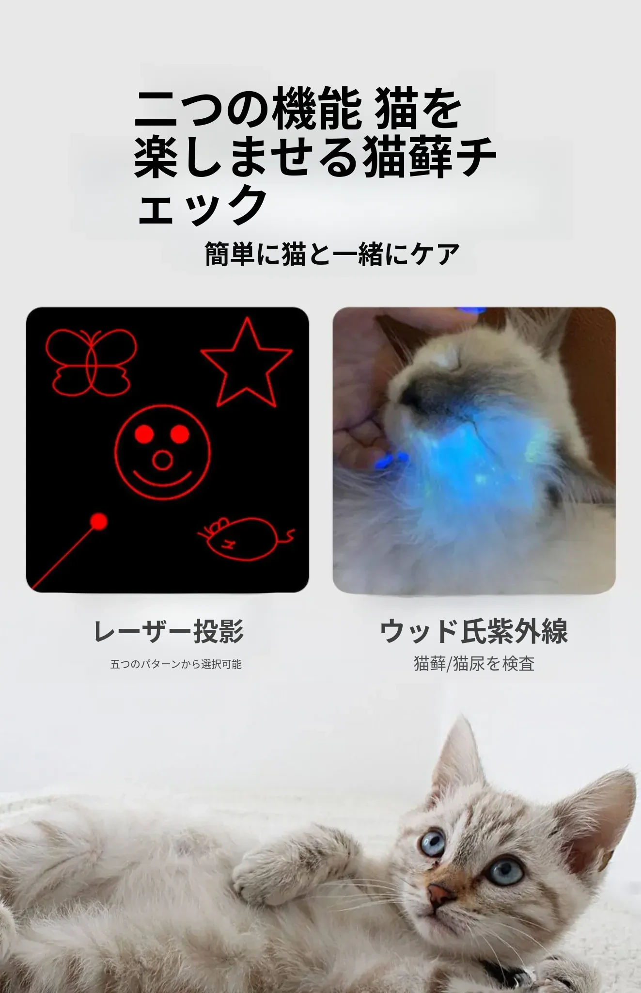 猫ちゃんが夢中になる!赤外線レーザーポインター付き多機能UVライト、猫の皮膚病を検査できるウッド氏のペット専用おもちゃ。楽しい遊びと健康チェックを同時に!