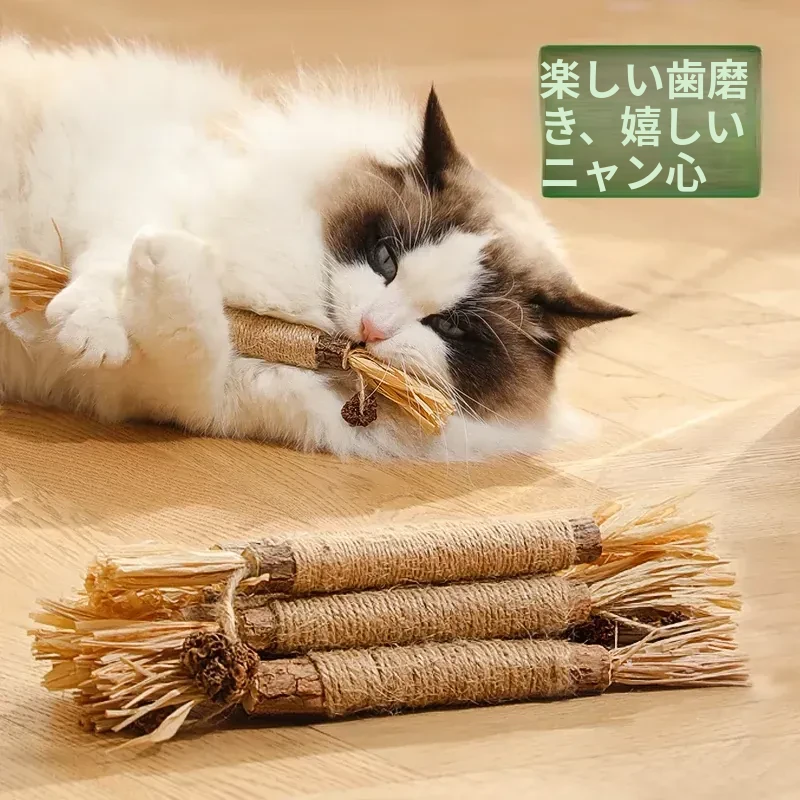 高品質ウッドキャットボーン歯磨きおもちゃ - 楽しくストレス解消!猫ちゃんのためのミントボール付き、噛むのに最適な耐久性あり、猫の健康をサポートする必須アイテム!