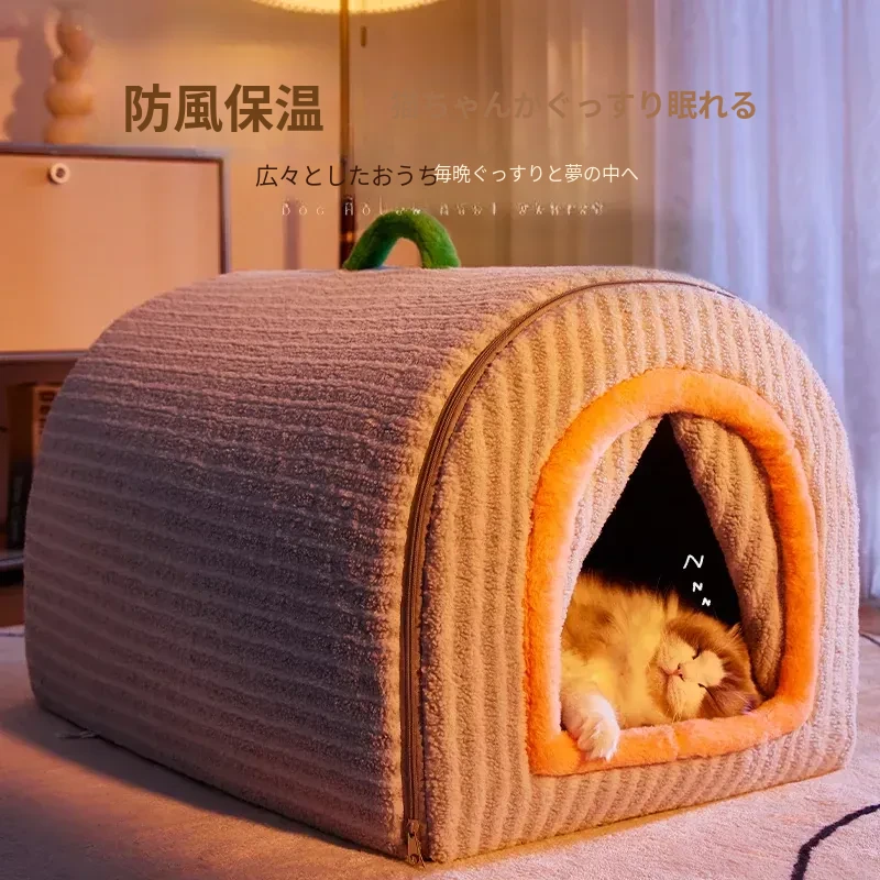 冬の寒さをしっかりガード!洗える猫ハウス - 四季対応の封閉式デザインで、愛猫に快適な眠りを提供します。寒い冬も安心して過ごせる、居心地抜群の猫ベッドです。